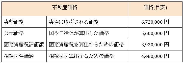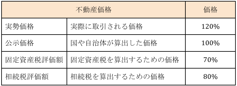 また土地の価格は複数あり、固定資産税評価額はそのうちのひとつです。土地の価格を予想する目安になりますので、下記の表を参考にしてください。