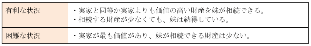 実家以外の財産が実家よりも価値が低い場合、妹にとっては不公平な遺産分割となり、遺産分割協議が難航する可能性があります。実家に大きな価値を見出しているのであれば、妹に多めに分割するなどの対応が必要になるでしょう。